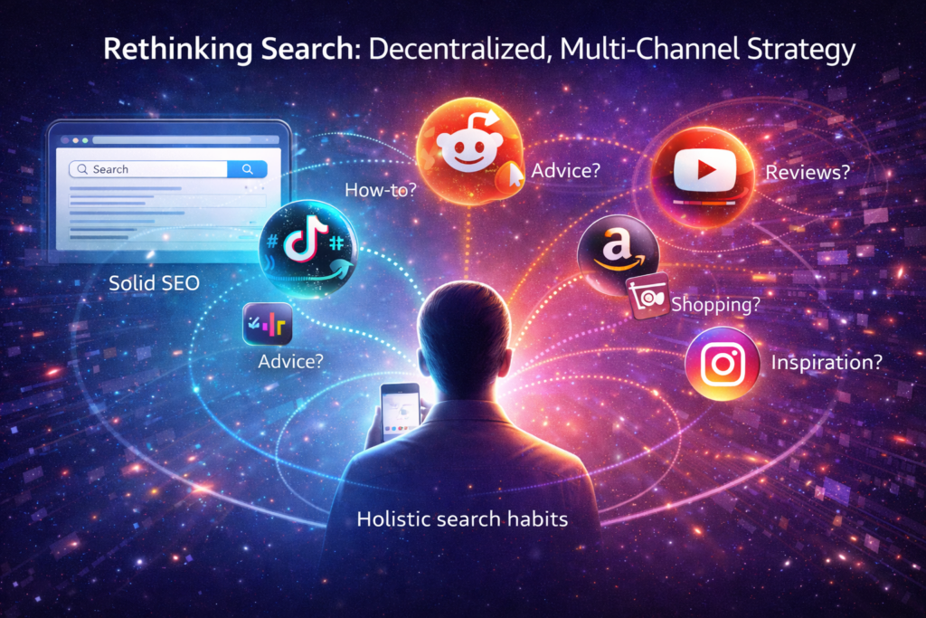 Previously, search optimization was largely a singular focus. However, user behavior has fundamentally fragmented. A Gen Z user might search #SkincareRoutine on TikTok for quick visual tutorials, while a hobbyist dives into Reddit’s r/woodworking for nuanced, peer-vetted advice, and a learner turns to YouTube for in-depth reviews. As a result, the “search bar” is now everywhere. This shift means that the Search Everywhere mindset isn’t optional; it’s the baseline for modern visibility. For instance, a query is no longer just a string of keywords—it’s a hashtag, a subreddit name, or a conversational phrase spoken to a camera.